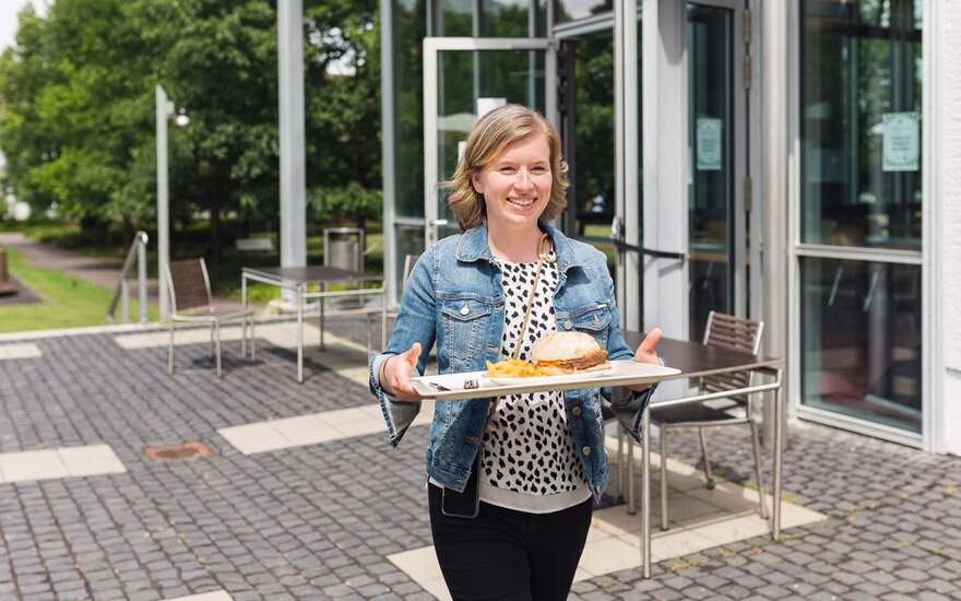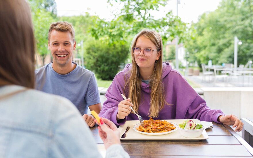 The canteen offers a choice of three meals daily. Always included: a vegetarian option, various side dishes and desserts. In good weather, students enjoy the sun in the outdoor area. Coffee, snacks and breakfast are available in the cafeteria. Both facilities together offer space for 200 people. The Aschaffenburg UAS canteen is located in the middle of the green campus, directly on the campus lawn, and can be quickly reached for the lunch break.