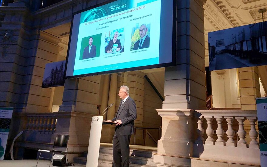Die Technische Hochschule Aschaffenburg gehört zu den Fördermitgliedern der IfKom. Sie wurde bei der Jubiläumsfeier durch Prof. Dr.-Ing. Michael Mann, Studiengangleiter des berufsbegleitenden Studiengangs Elektro- und Informationstechnik, und Dipl.-Ing. Cornelia Böhmer, Mitglied des Weiterbildungsteams B3S, vertreten. Die Präsidentin der TH Aschaffenburg, Prof. Dr. Eva-Maria Beck-Meuth, hob in ihrem vorab übermittelten Grußwort u. a. den Netzwerkgedanken des Verbandes hervor, der insbesondere die Industrie und die Politik einbezieht sowie Orientierungshilfe für Berufsanfängerinnen und Berufsanfängern gibt. Ebenso würdigte sie die Verbandspositionen nach einem stärkeren Fokus auf den Aspekt der Nachhaltigkeit in der Ingenieurausbildung und zu den Chancen der Digitalisierung.