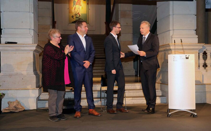 Der Preisträger hält lächelnd seine Urkunde in den Händen. Neben im in einer Reihe stehen Professor Mann, der IfKOM-Bundesvorsitzende Heinz Leymann und Cornelia Böhmer