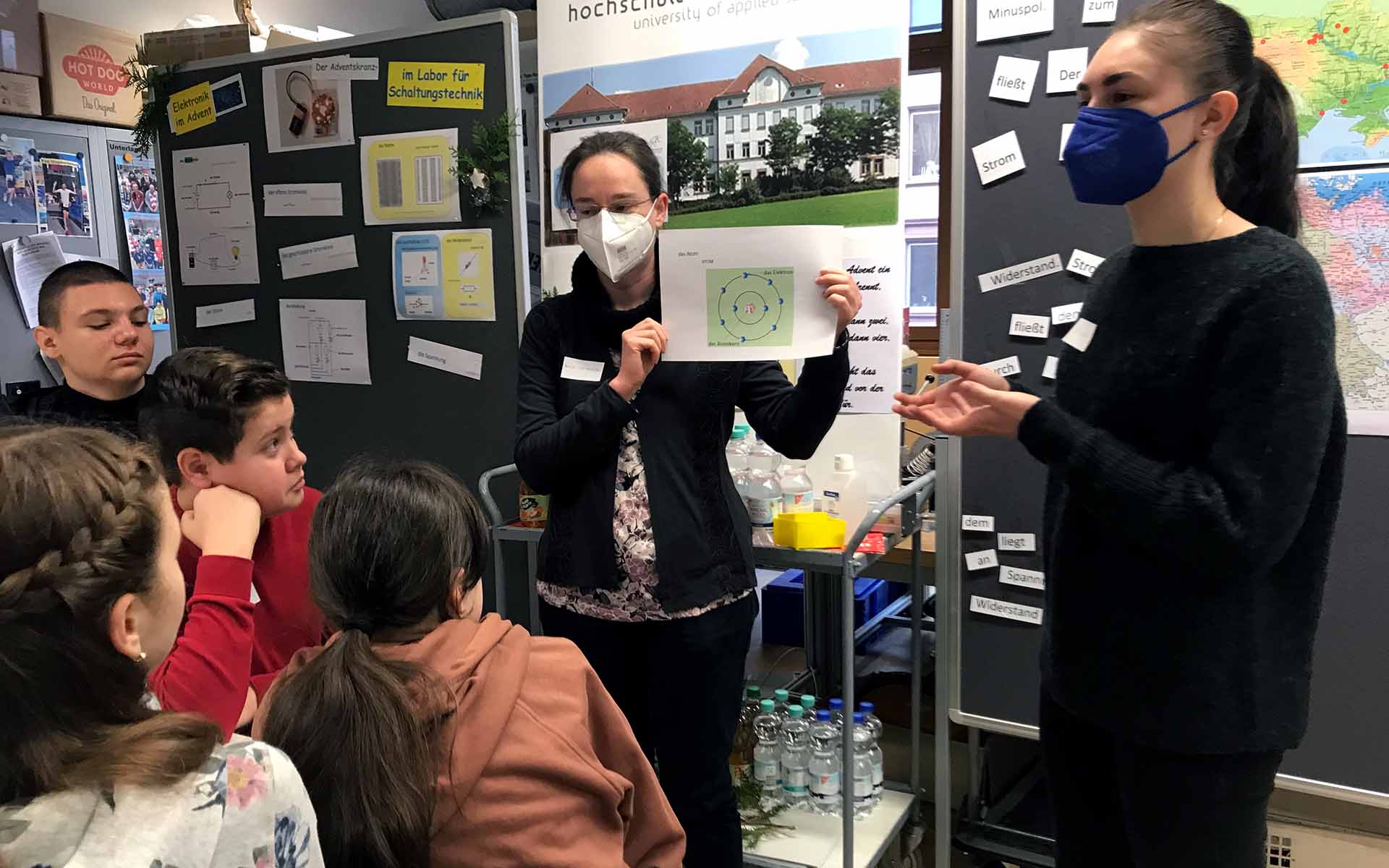 Im Labor der TH erklärten Bettina Sickenberger, Anne-Catherine Probst und Diana Khropost nach einer kurzen Vorstellung aller Teilnehmenden auf Deutsch und Ukrainisch, wie Drähte, Widerstände, LEDs und der Schalter zusammengesteckt werden müssen, damit alles funktioniert und die LEDs leuchten. Dazu erfuhren die Gäste jede Menge Wissenswertes über die Gewinnung von Energie aus Kraftwerken und über erneuerbare Energien, und erhielten Hintergrundinformationen über den Aufbau von Schaltungen. Die Physiklehrerin, Frau Zimmermann, und Frau Olta als Übersetzerin halfen tatkräftig mit, die Kinder und Jugendlichen beim Zusammenbau des Adventskranzes zu unterstützen. Und so konnte am Ende jeder und jede eine eigene Schaltung mit nach Hause nehmen. Außerdem bekamen sie noch ein Heft des Energiesparfuchses und einen Wochenkalender für das Schuljahr mit hilfreichen Energiespartipps. Für die Schülerinnen und Schüler, die mit Feuereifer bei der Sache waren, war dies ein rundum gelungener Workshop, bei dem sie spannende Einblicke in die Welt der Ingenieurwissenschaften und Informatik erhielten.
