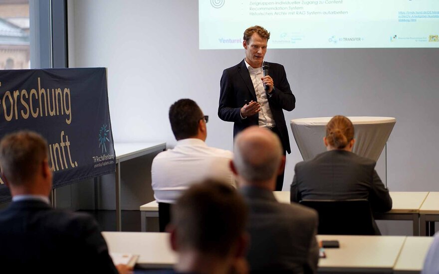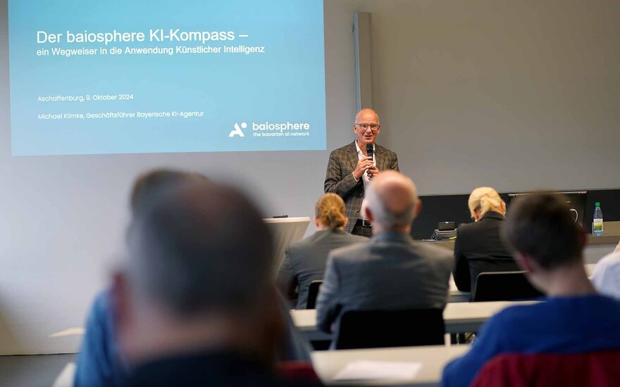 Dr. Michael Klimke, Geschäftsführer von baiosphere, stellte das Bayerische KI-Netzwerk und den KI-Kompass vor. Annabel Schwenda von der appliedAI, Europas größter Initiative für die Anwendung vertrauenswürdiger KI-Technologie in Unternehmen, gab ebenfalls einen Einblick in ihre erfolgreiche Arbeit im Hinblick auf das Regionalzentrum.