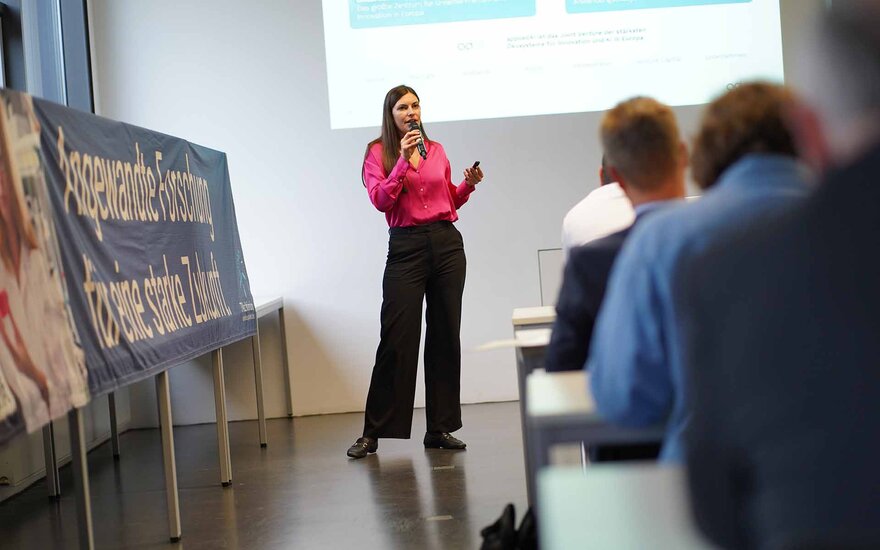 Professor Bauke skizzierte die bisherigen Erfolge der ersten beiden Runden, in denen regionale kleine und mittelständische Unternehmen in individuellen Coachingprojekten beim nachhaltigen Aufbau eigener Expertise im Bereich „Künstliche Intelligenz“ durch Wissenschaftlerinnen und Wissenschaftler der Technischen Hochschule unterstützt wurden. Dabei zeigte er auf, wie sich das vor zwei Jahren eröffnete KI-Regionalzentrum an der TH Aschaffenburg etabliert und die Zusammenarbeit mit den beteiligten Unternehmen bereichert hat: 6 von 7 Unternehmen gründeten eine interne KI-Organisationseinheit, hundert Prozent der Unternehmen überführten die Projekte in Produkte oder produktive Prozesse.