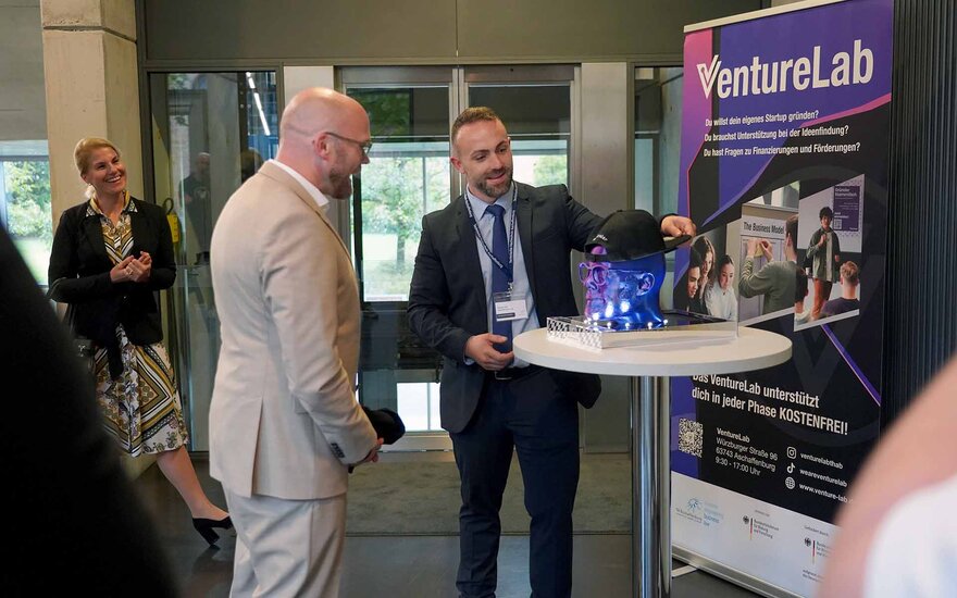 • Kevin Geis, Mitglied des VentureLab-Teams, überreichte Staatsminister Mehring einen 3-D-Druck seines Kopfes. Das von Prof. Dr. Boris Bauke geleitete VentureLab fördert den Transfer von Wissen und Forschung in konkrete technologiebasierte Produkte und Dienstleistungen: von der ersten eigenen Idee über die Prototypen- und Produktentwicklung, bis zur eigenständigen Unternehmung (Startup). Unter anderem betreibt das VentureLab dafür die KI-Community KIBU. Die Community transferiert anwendungsorientiertes Wissen über KI durch Meetups, Workshops, betreute Lerneinheiten, Hackathons und eine offene KI-Sprechstunde in KMUs aus der Region.