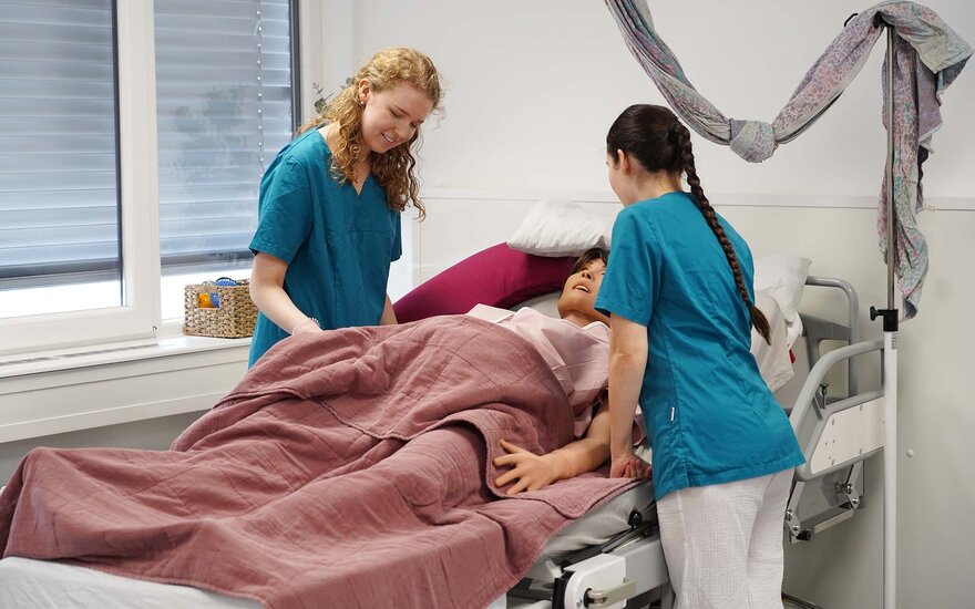 • Zwei Studentinnen zeigen im Skills Lab den Umgang mit einer lebensgroßen Schwangerenpuppe.