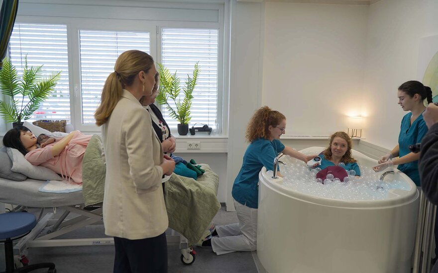 Bei einer gemeinsamen Besichtigungstour erhielt die Ministerin Einblick in das mit modernster Technik und Simulationspuppen ausgestattete Skills Lab. Hier erklärte Prof. Dr. Lena Agel, Gründungsdekan der Fakultät Gesundheitswissenschaften, wie sich in den detailgetreu ausgestatten Räumlichkeiten die unterschiedlichen Betreuungssituationen in der Arbeit der angehenden Hebammen realitätsnah simulieren lassen, so dass diese dort spezifische Fertigkeiten und Fähigkeiten praktisch erlernen und üben können.