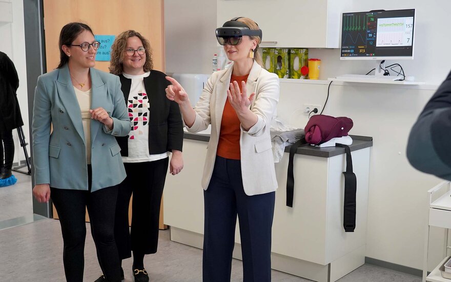 • Professorin Hemma Pfeifenberger (links) und Prof. Dr. Lena Agel (2. v. l.) erklären Staatsministerin Judith Gerlach den Einsatz der VR-Brille, mit der die Geburtsmechanik dargestellt werden kann, im Studiengang Hebammenkunde.