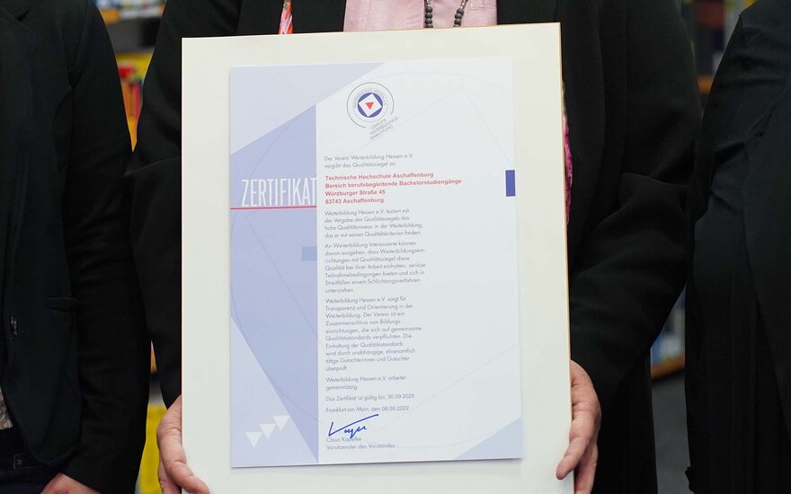 Erstmalig erhielt die TH Aschaffenburg im Jahr 2016 vom Verein „Weiterbildung Hessen e.V.“ für ihre berufsbegleitenden Studienangebote mit Bachelorabschluss das Gütesiegel "Geprüfte Weiterbildungseinrichtung". Nun wurden die Studiengänge, bei denen die Technische Hochschule Aschaffenburg mit der Hochschule Darmstadt zusammenarbeitet, bereits zum zweiten Mal für eine Laufzeit von drei Jahren rezertifiziert. Dies bescheinigt die hohe Qualität des Studienangebots für Berufstätige in den Bereichen Elektro- und Informationstechnik sowie Wirtschaftsingenieurwesen und ebenso des individuellen Modulstudiums. Gleichzeitig verpflichtet sich die TH Aschaffenburg, die Qualitätsstandards kontinuierlich einzuhalten. Außerdem erhält die Hochschule von erfahrenen Gutachterinnen und Gutachtern wertvolle Hinweise zur ständigen Weiterentwicklung ihrer Weiterbildungsangebote.