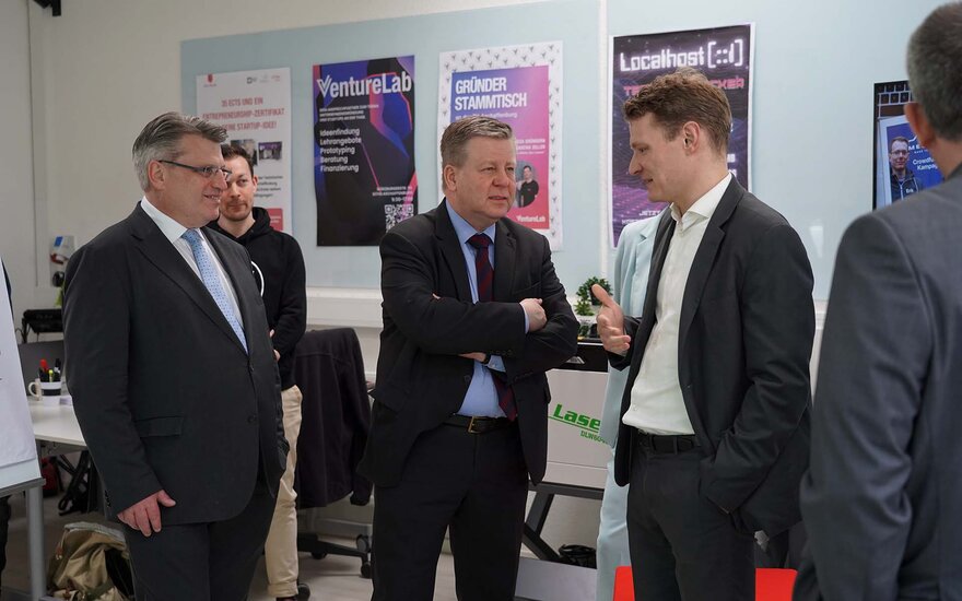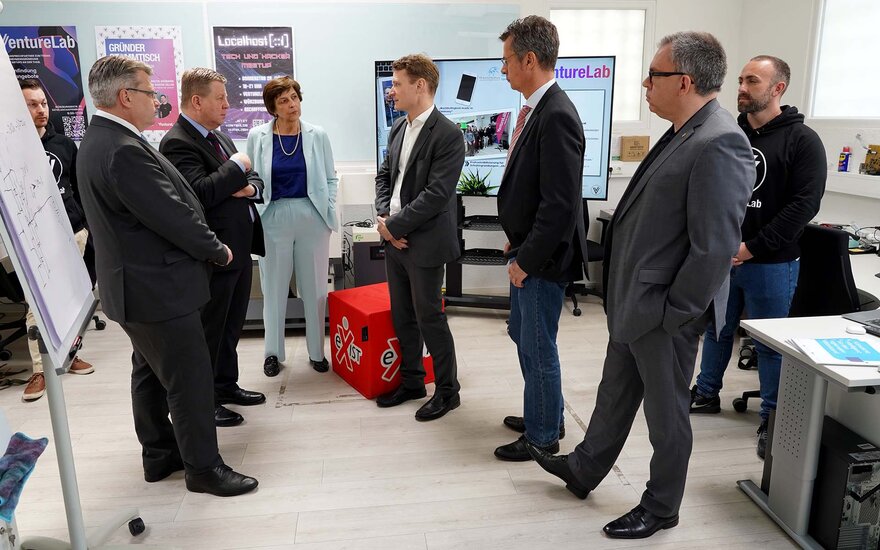 Im VentureLab, das von Prof. Dr. Boris Bauke geleitet wird, ließen sich Brannekämper und Bausback erläutern, wie die Hochschule hier Studierende, Absolventinnen und Absolventen sowie Forschende dabei unterstützt, wissenschaftliche Erkenntnisse gepaart mit innovativen Ideen in die unternehmerische Praxis zu übertragen. Dabei bietet das VentureLab technischen Support und Gerätschaften sowohl im Bereich der Software-Entwicklung als auch im Bereich der Hardware-Entwicklung. Ideen für Innovationen können hier skizziert, entwickelt und mit potentiellen Kundinnen und Kunden getestet werden.