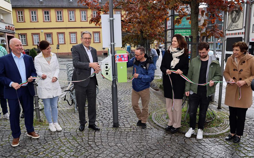 • Bei der Einweihung der neuen E-Bike-Ladestation (v. l. n. r.): Bürgermeister und Digitalreferent Eric Leiderer, Annegret Aulbach (Stadt Aschaffenburg, Amt für IT und Digitalstrategie, Projektleiterin dima), Oberbürgermeister Jürgen Herzing, Jörn Büttner (Radverkehrsbeauftragter der Stadt Aschaffenburg) Dr. Petra Blumenroth (Bayern Innovativ GmbH, Projektmanagerin Transformation und Wandel), Stefan Bestelmeyer (Bayern Innovativ GmbH, Projektmanager Digitalisierung), Prof. Dr. Eva-Maria Beck-Meuth (Präsidentin, TH AB) (Foto: Ralf Hettler/ Stadt Aschaffenburg)