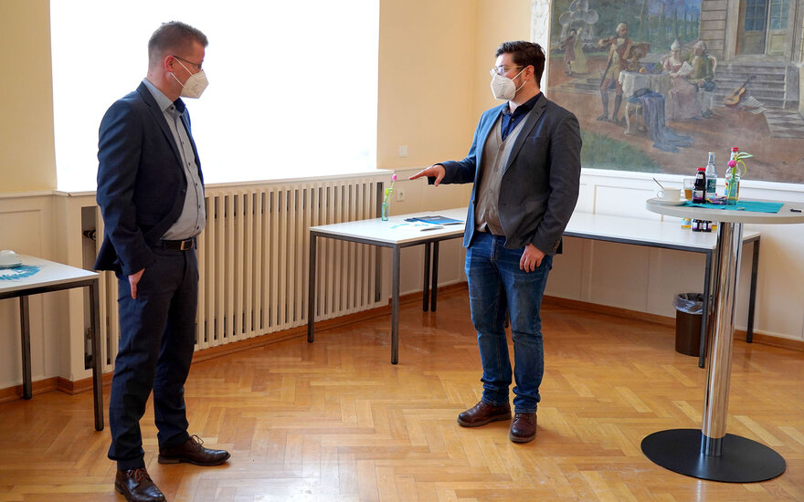 • Der Vizepräsident für Forschung, Klaus Zindler in der Diskussion mit Manuel Michniok, Stadtrat und Aschaffenburgs SPD-Vorsitzender