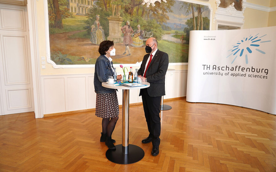 Erstmalig konnte Bernd Rützel den Hock-Saal erleben, wo ein reges Gespräch mit der Präsidentin der TH Aschaffenburg, Prof. Dr. Eva-Maria Beck-Meuth und den beiden Vizepräsidenten, Prof. Dr. Holger Paschedag und Prof. Dr. Klaus Zindler stattfand. Der denkmalgeschützte Hock-Saal bot nicht nur einen festlichen Rahmen für den Empfang, sondern auch genügend Möglichkeit, die in Pandemiezeiten gebotenen Abstände einzuhalten.