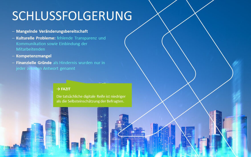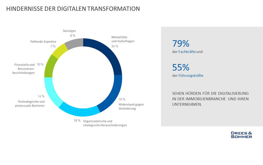 Vor die Frage gestellt, warum es darüber hinaus nicht vorangeht, nennen die Befragten vor allem Mentalitäts- und Kulturfragen: Für rund ein Viertel sind diese der entscheidende Grund, der die digitale Entwicklung behindert. Jeder Fünfte stellt eine generelle Widerstandshaltung gegenüber Veränderungen im Unternehmen fest. Aber auch organisatorische und strategische Hindernisse (18 Prozent) sowie technologische und prozessuale Barrieren (14 Prozent) stehen dem digitalen Wandel im Weg.