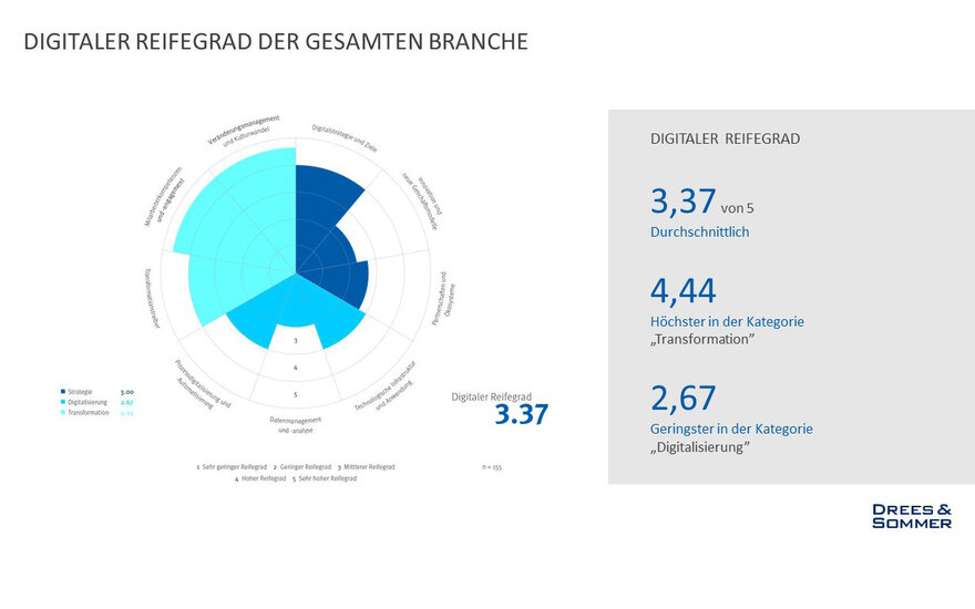 Gemeinsam für die Studie entwickelten Prof. Dr. Verena Rock und ein Drees & Sommer-Projektteam ein digitales Reifegradmodell und werteten dieses aus. Das Modell gibt anhand der drei Dimensionen Strategie, Digitalisierung und Transformation Aufschluss darüber, wie weit die digitale Transformation in den verschiedenen Bereichen eines Unternehmens schon vorangeschritten ist. Als Grundlage diente eine quantitative Befragung von 155 Fach- und Führungskräften aus der Immobilienwirtschaft. Zu je etwa einem Drittel sind die Befragten der Geschäftsführungs-, Team- und Bereichsleitungs- oder Fachexpertenebene zugehörig mit einer ausgewogen verteilten Altersstruktur. Die Teilnehmenden verteilen sich breit über die Wertschöpfungsstufen der Bau- und Immobilienwirtschaft.
