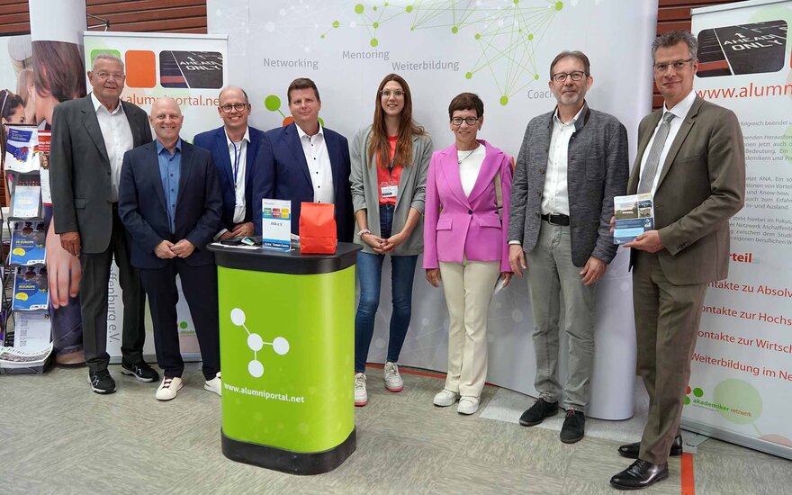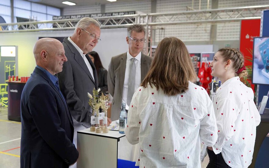 Michael Baumann, Stellvertreter des Landrats des Landkreises Aschaffenburg, Günther Oettinger, Stellvertreter des Landrats des Landkreises Miltenberg und Eric Leiderer, Bürgermeister der Stadt Aschaffenburg, verschafften sich bei einem gemeinsamen Rundgang durch die Ausstellungshalle mit Prof. Dr. Ivo Schäfer, Vizepräsident für Studium, Lehre und Internationales, Kanzlerin Heide Klug und Ernst Schulten, Leiter des International Office und Career Service, einen Eindruck von den ausstellenden Unternehmen und Institutionen. Die drei Politiker lobten die gute Organisation der Messe seitens der Hochschule und freuten sich über die Vielfalt der Firmen aus der Region, die den Studierenden vielversprechende berufliche Perspektiven bieten.