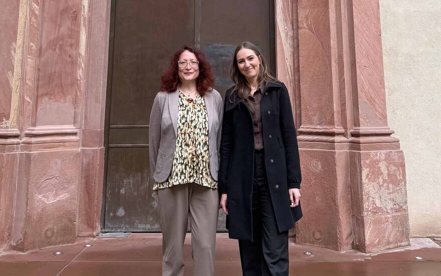 • Angela Warkentin (rechts) mit Prof. Dr. Renate Link vor dem historischen Portal der TU Darmstadt