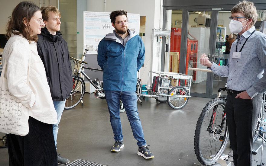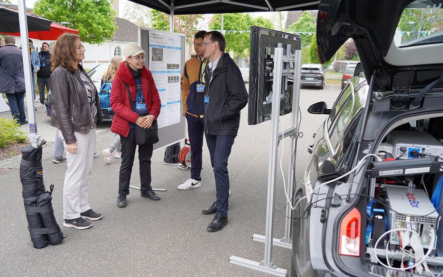• Bürgermeisterin Jessica Euler (links) lässt sich von Prof. Dr. Konrad Doll (rechts) die Methoden des intelligenten Fußgängerschutzes beim autonomen Fahren erklären