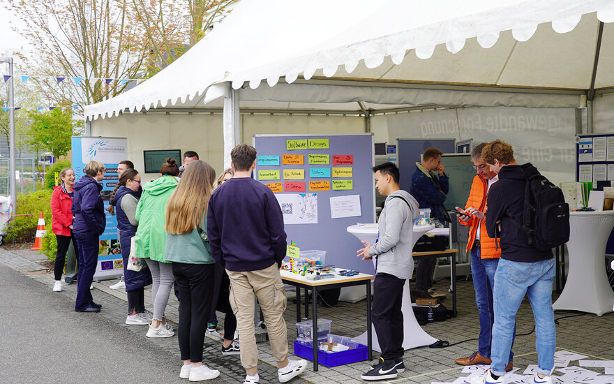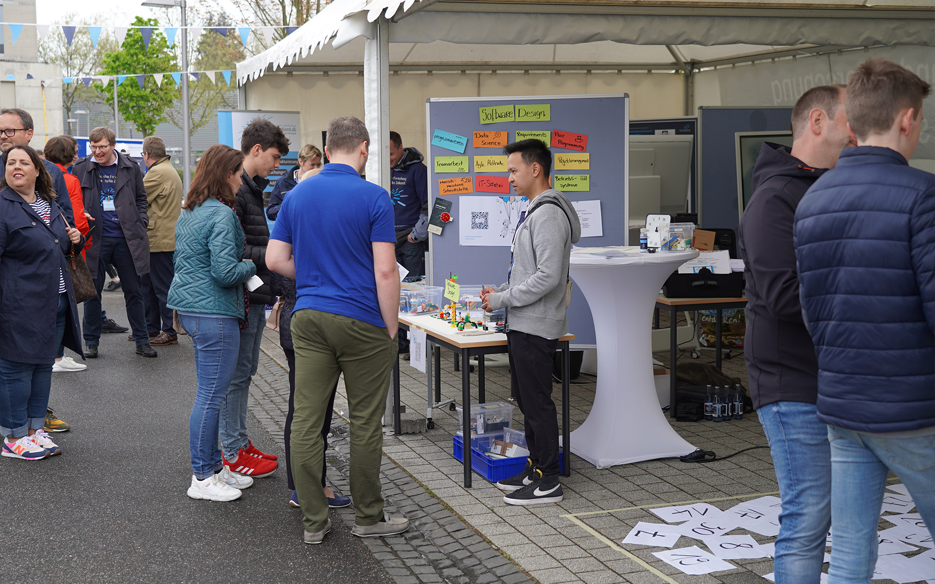 Im Forschungsbereich gab es ebenfalls jede Menge zu entdecken. Bei Live-Demos im Freien wurden z. B. ein selbststeuernder Gabelstapler gezeigt oder Methoden des intelligenten Fußgängerschutzes beim autonomen Fahren vorgestellt. Die Science Lounge lud mit vielfältigen Stationen der angewandten Forschung zum Erkunden ein: Wie kann ich mit einem 3D-Drucker Schokolade drucken? Woher weiß die künstliche Intelligenz, wie ich mich fühle? Wie funktioniert ein Photovoltaik-Sonnenschirm und wie sieht die digitale, nachhaltige Stadt der Zukunft aus? Das waren nur einige Themen, auf die die Besucherinnen und Besucher Antworten bekamen und dabei selbst experimentieren konnten. Darüber hinaus waren insgesamt elf Labore zum Besichtigen geöffnet.