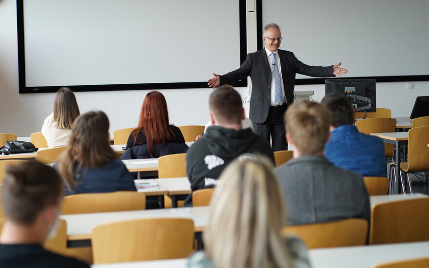 • Prof. Dr. Hartwig Webersinke, Dekan der Fakultät Wirtschaft und Recht, beim Übersichtsvortrag zum Studium