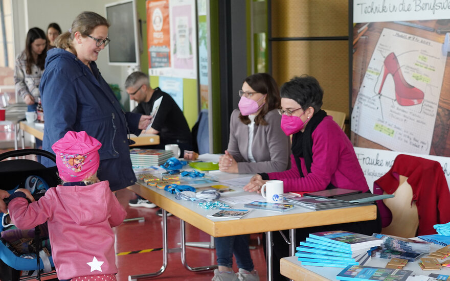 An zahlreichen Ständen konnten sich die Besucherinnen und Besucher zu verschiedenen Themen und Bereichen der Hochschule informieren und beraten lassen – vom Studienbüro, den berufsbegleitenden Studienangeboten und dem Dualen Studium über das Familien- und Frauenbüro und das Green Office bis hin zum International Office, dem Sprachenzentrum, dem Venture Lab und der Studentenvertretung. Die Hochschulbibliothek gewährte Einblicke in das umfangreiche Medienangebot. In der Mensa bekamen die Besucherinnen und Besucher einen kleinen Vorgeschmack auf die dort angebotenen Speisen.