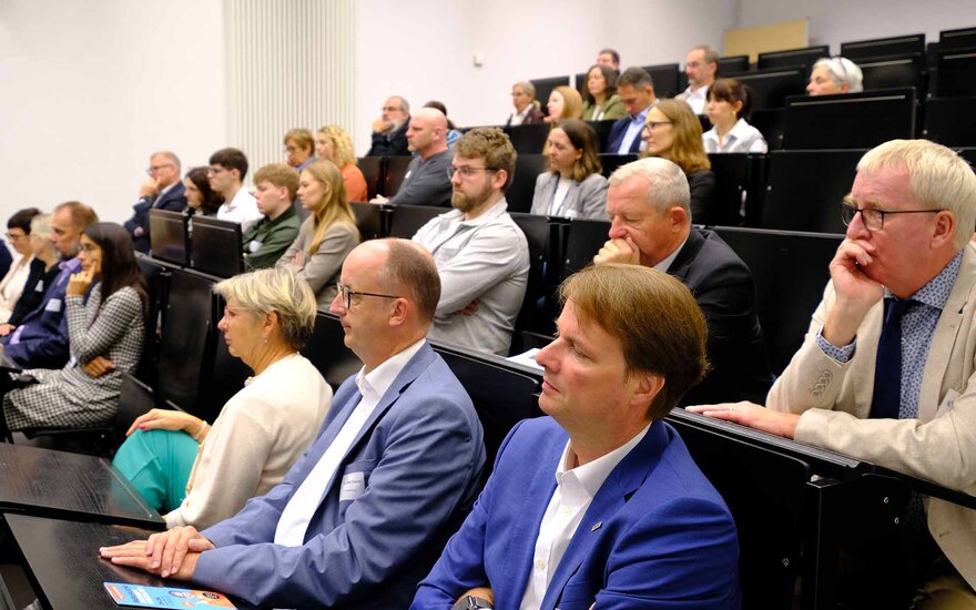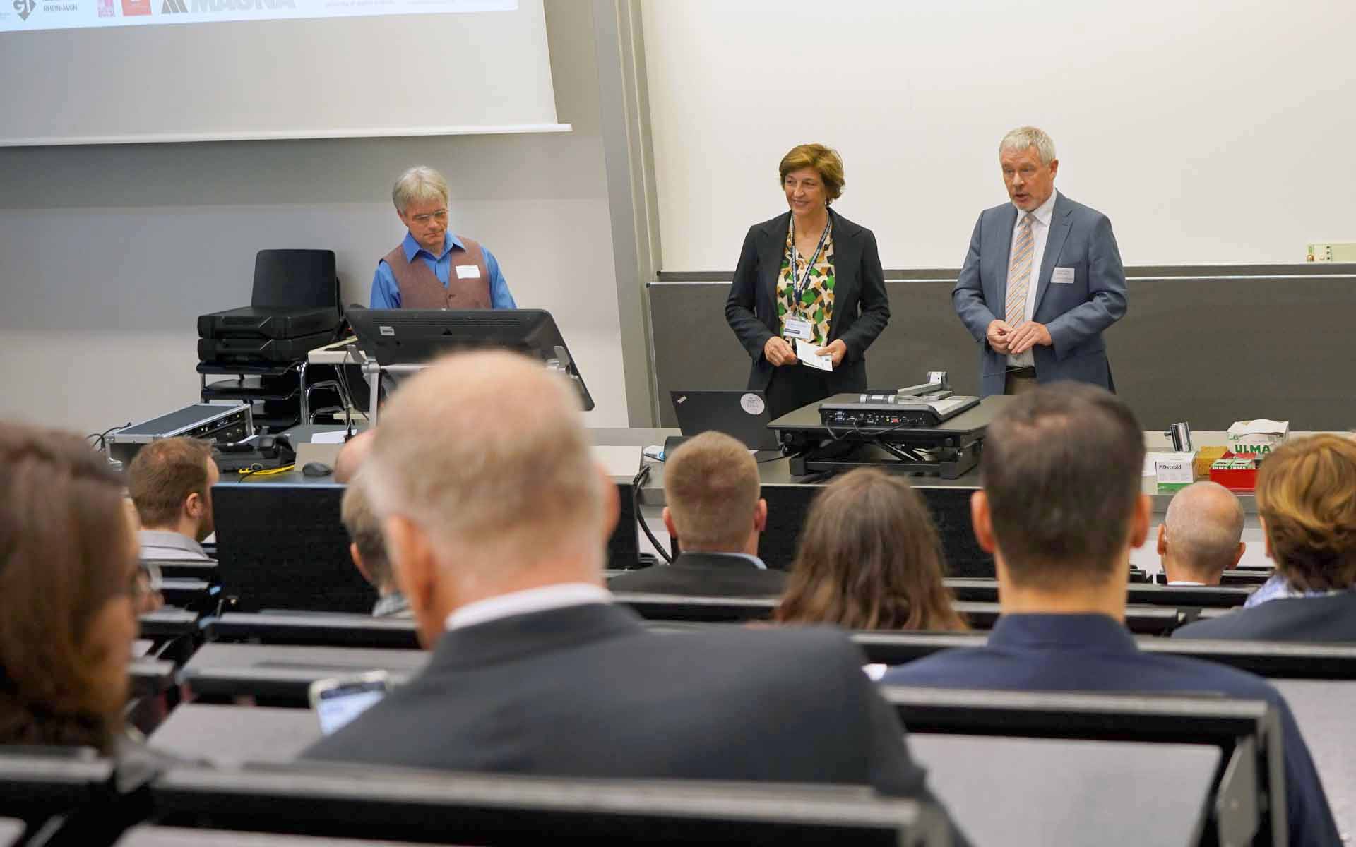 Bild ganz oben (v. l. n. r.): Joachim Schmitt, TH-Präsidentin Prof. Dr. Eva-Maria Beck-Meuth und Prof. Dr. Georg Rainer Hofmann bei der Eröffnung des Symposiums an der TH Aschaffenburg.