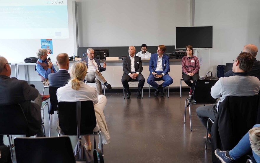Gegen Ende des Symposiums beleuchtete eine Fishbowl-Diskussion mit Expertinnen und Experten aus Hochschule und Wirtschaft die Frage, wie Innovationen in den heimischen Unternehmen befördert werden können. Wie lässt sich die teilweise schwierige Situation von Unternehmen mithilfe innovativer Produkte und Dienstleistungen verbessern? An der Fishbowl nahmen die Professorin Dr. Marie Caroline Oetzel, Dr. Gerald Heimann (Bayern innovativ), Prof. Dr. Heiko Wenzel-Schinzer (Wenzel Group) sowie Prof. Dr. Georg Rainer Hofmann teil.