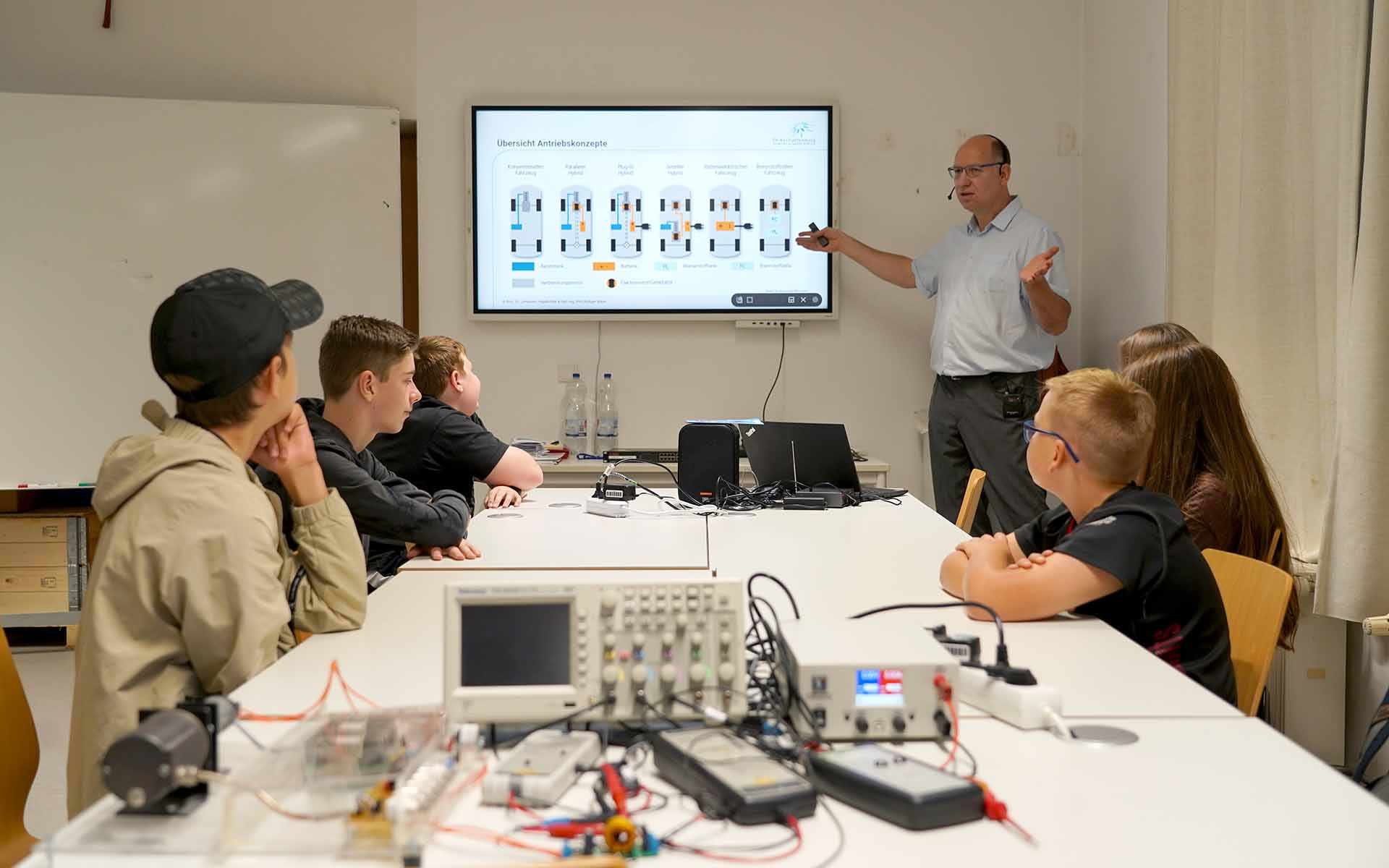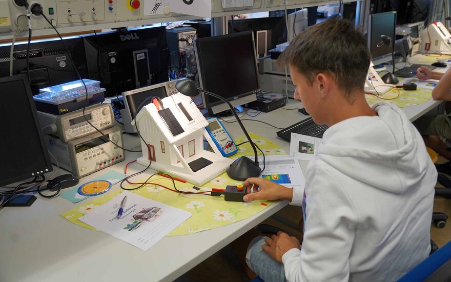Versuche zu Solarthermie und Photovoltaik veranschaulichten im Workshop „Energie zu Hause“ die praktische Anwendung erneuerbarer Energien. Im Workshop „Warum können Elektroautos so schnell beschleunigen?“ erfuhren die Teilnehmenden, wie Elektroautos aufgebaut sind und wie die Antriebskomponenten funktionieren.