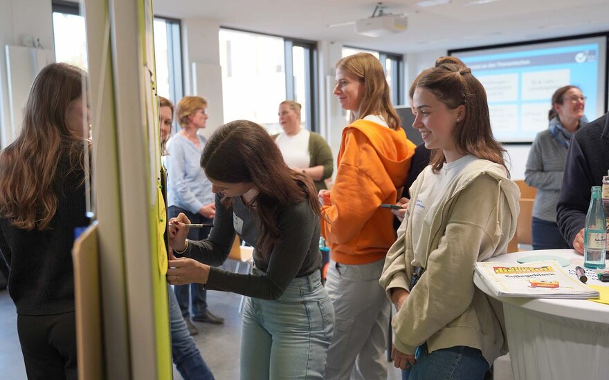 • Studierende schreiben ihre Diskussionsergebnisse auf.