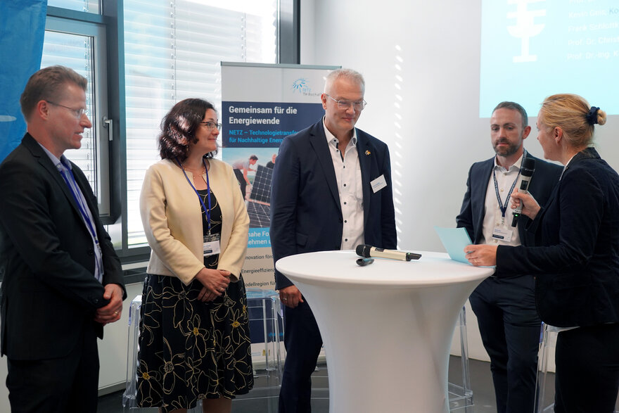 • Interview zu Transferangeboten der TH AB. V. l. n. r.: Prof. Dr.-Ing. Klaus Zindler, Prof. Dr. Victoria Bertels, Frank Schlottke, Kevin Geis und Katrin Küx