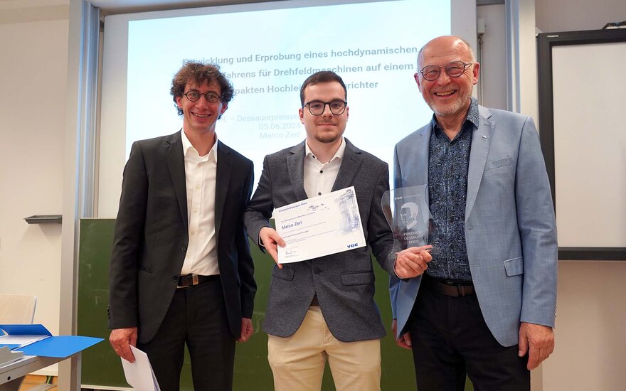 • v.l.n.r.: Prof. Dr. Ingo Jeromin (2. Vorsitzender des VDE Rhein-Main), Marco Zerl (Preisträger), und Prof. Rolf Bergbauer (Geschäftsführer des VDE Rhein-Main)