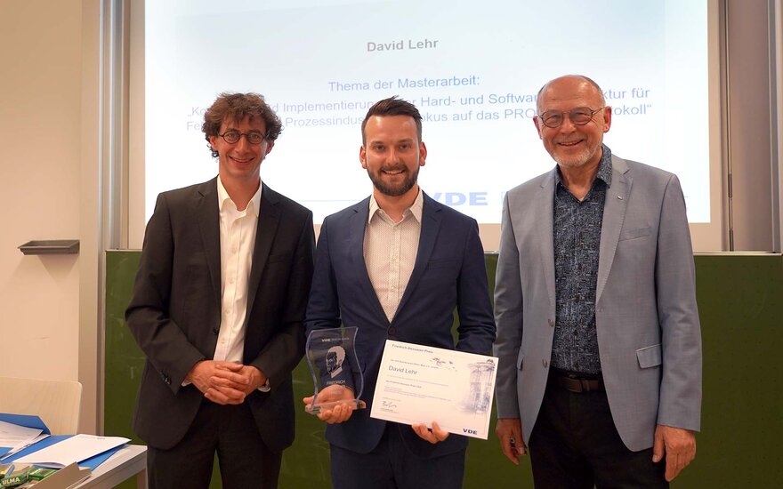 • v.l.n.r.: Prof. Dr. Ingo Jeromin (2. Vorsitzender des VDE Rhein-Main), David Lehr (Preisträger), und Prof. Rolf Bergbauer (Geschäftsführer des VDE Rhein-Main)