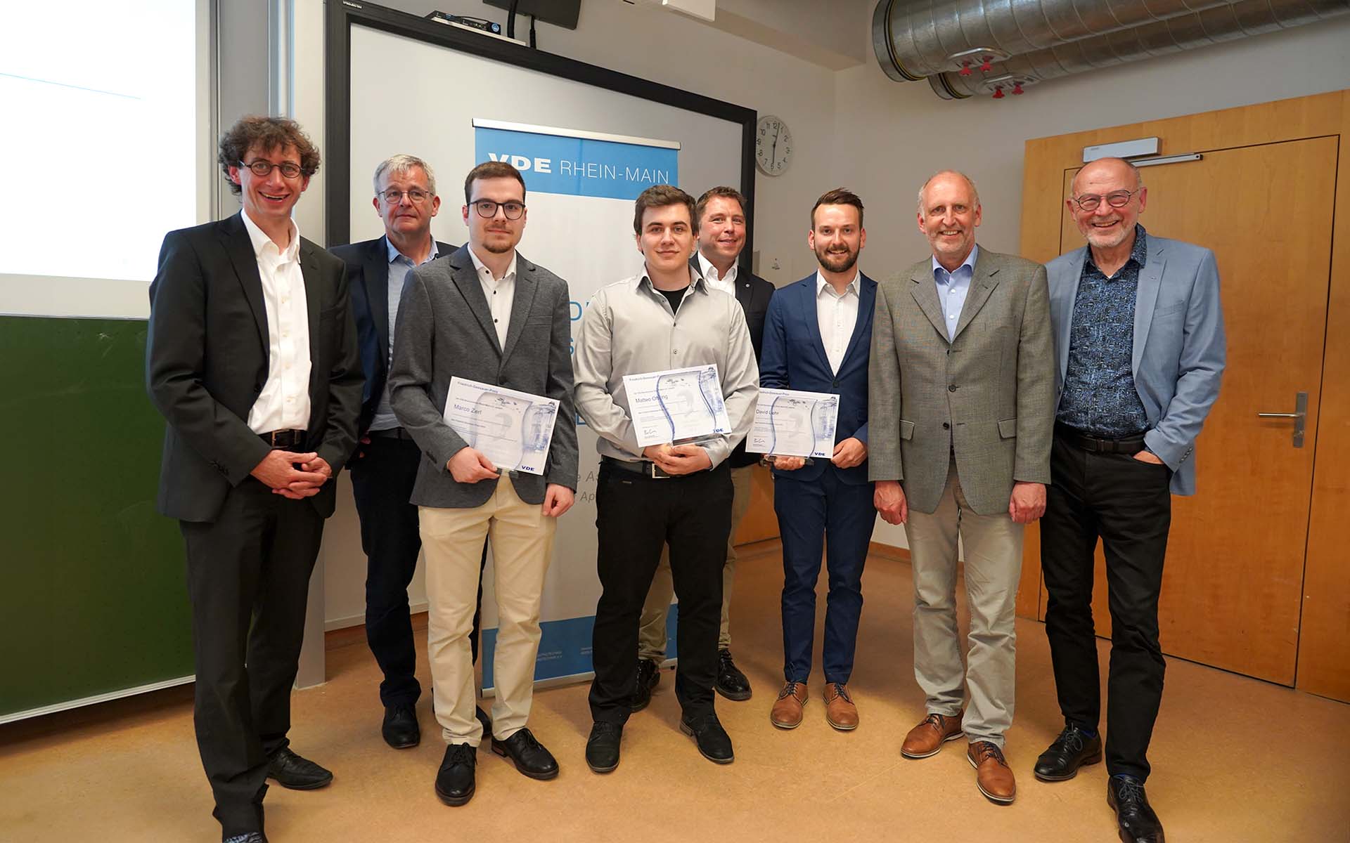 Titelfoto oben v.l.n.r.:  Prof. Dr. Ingo Jeromin (2. Vorsitzender des VDE Rhein-Main), Prof. Dr.-Ing. Johannes Teigelkötter (betreuender Professor), Marco Zerl (Preisträger), Matteo Oftring (Preisträger), Prof. Dr.-Ing. Michael Mann (betreuender Professor), Prof. Dr.-Ing. Peter Fischer und Prof. Rolf Bergbauer (Geschäftsführer des VDE Rhein-Main)