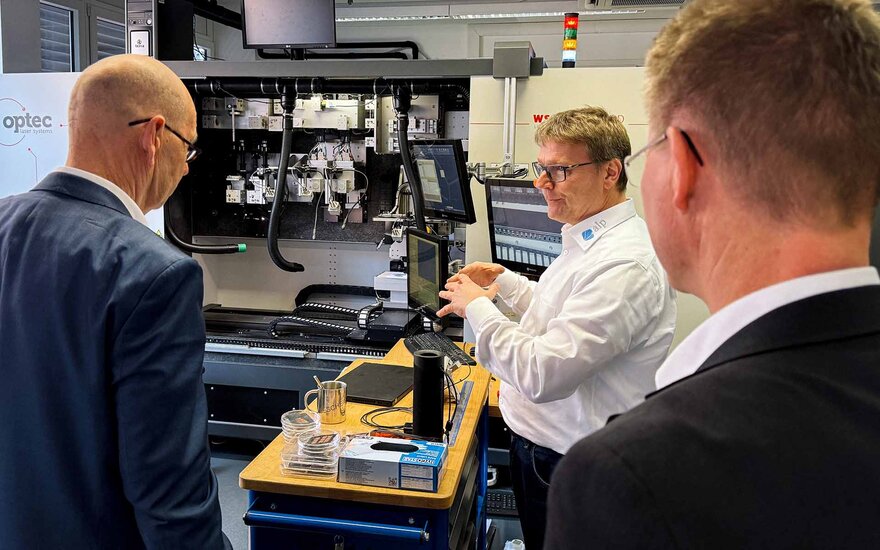 • Prof. Dr. Ralf Hellmann (Mitte) gibt Dr. Peter Altvater (links) einen Überblick über die anwendungsnahen Forschungsinhalte des Open Innovation Labs im Bereich Lasermaterialbearbeitung, Additive Fertigung, Werkstoffuntersuchungen und Messtechnik, vorne rechts: Prof. Dr.-Ing. Klaus Zindler