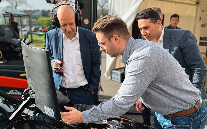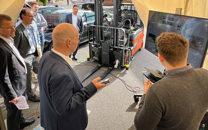 • Doktorand Manuel Gorks (rechts) präsentiert Ergebnisse des Forschungsprojektes KAnIS zur Verbesserung der Effizienz von intralogistischen Prozessen durch kooperative autonome Flurförderzeuge (Kooperation mit Linde Material Handling), links neben ihm Dr. Peter Altvater, Prof. Dr.-Ing. Klaus Zindler, Prof. Dr.-Ing. Konrad Doll und hinten rechts Prof. Dr.-Ing. Mohamed Krini