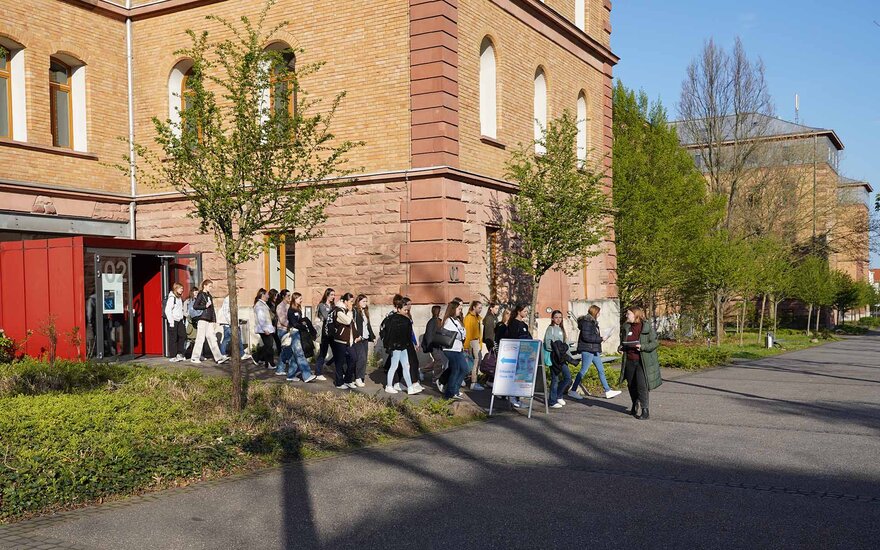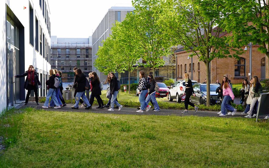 • Die Frauenbeauftragte der Hochschule, Prof. Dr. Kristina Balleis, begrüßt die Schülerinnen auf dem Campus der TH Aschaffenburg.