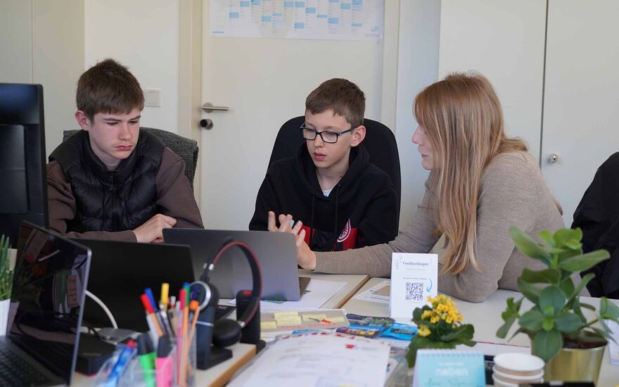 Zwei Achtklässler im Alter von 13 Jahren nutzten am Boys´ Day die Chance, in die Stabsstelle Marketing hineinzuschnuppern. Hier erfuhren sie Interessantes rund um das Thema Markenrecht, bekamen beispielsweise gezeigt, wie man Visitenkarten gestaltet und konnten ausprobieren, was man bei einem professionellen Fotoshooting alles beachten muss.