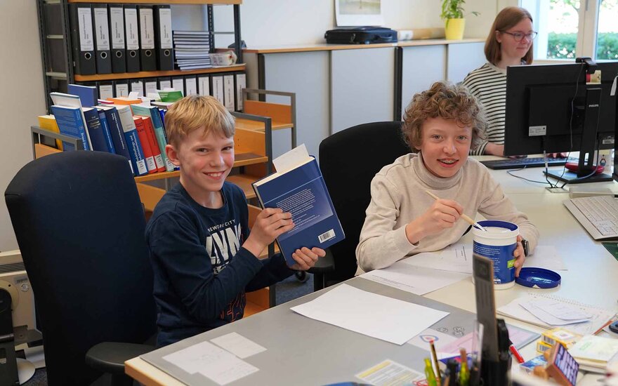 Ein Junge aus der 5. und einer aus der 7. Klasse lernten in der Hochschulbibliothek verschiedene Berufsbilder kennen. Die beiden halfen mit, Bestellungen zum Fernleihversand herauszusuchen und den Literaturbestand zu pflegen. Dabei erhielten sie unter anderem auch Einblick in die technische Buchbearbeitung, das Designen von Plakaten und die Tätigkeiten an der Service-Theke.