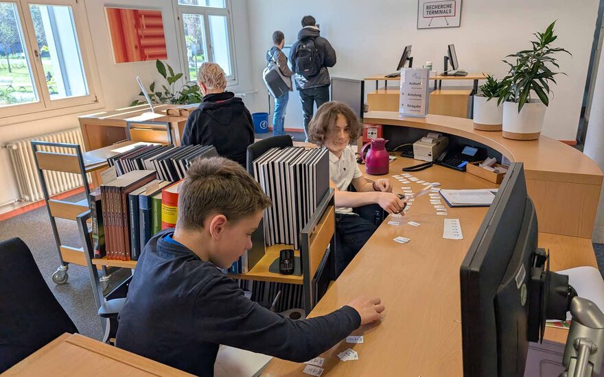 In der Hochschulbibliothek halfen zwei Schüler bei der Vorbereitung des Open Campus und erstellten mithilfe von KI-Tools ein Infoposter über den Bücherwurm. Sie erkundeten die Bibliothek bei einer interaktiven Führung, erhielten Einblicke in bibliotheksspezifische Tätigkeiten und lernten verschiedene Ausbildungswege kennen.