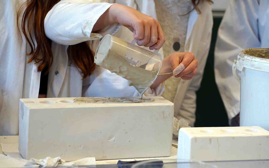 • Teilnehmerinnen beim Girls Day beim Bearbeiten von Tonmasse gemeinsam mit Professor in weißen Kitteln