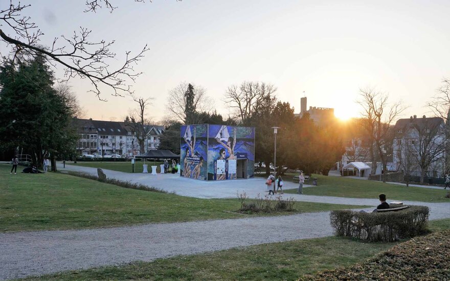 • Von März bis Juni 2022 war der Kirchner-Kubus in der Konrad-Adenauer-Anlage in Königstein zu sehen und erinnerte an das Schaffen des großen Expressionisten während seiner Zeit in dieser Stadt im Taunus.