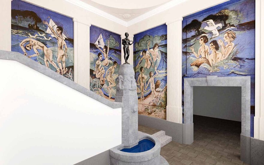 • Der ursprüngliche Raum der Wandgemälde - der Brunnenturm des Sanatoriums Dr. Kohnstamm - wurde originalgetreu im Kirchner-Kubus nachgebildet.