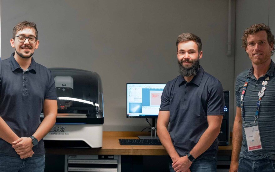 • Eric Scheidler, Lukas Illig (beide Fa. LPKF) und Lukas Roggli (Workshop-Manager) nach getaner Arbeit mit dem ProtoMat S64 (Quelle: ICT Berufsbildungscenter AG)