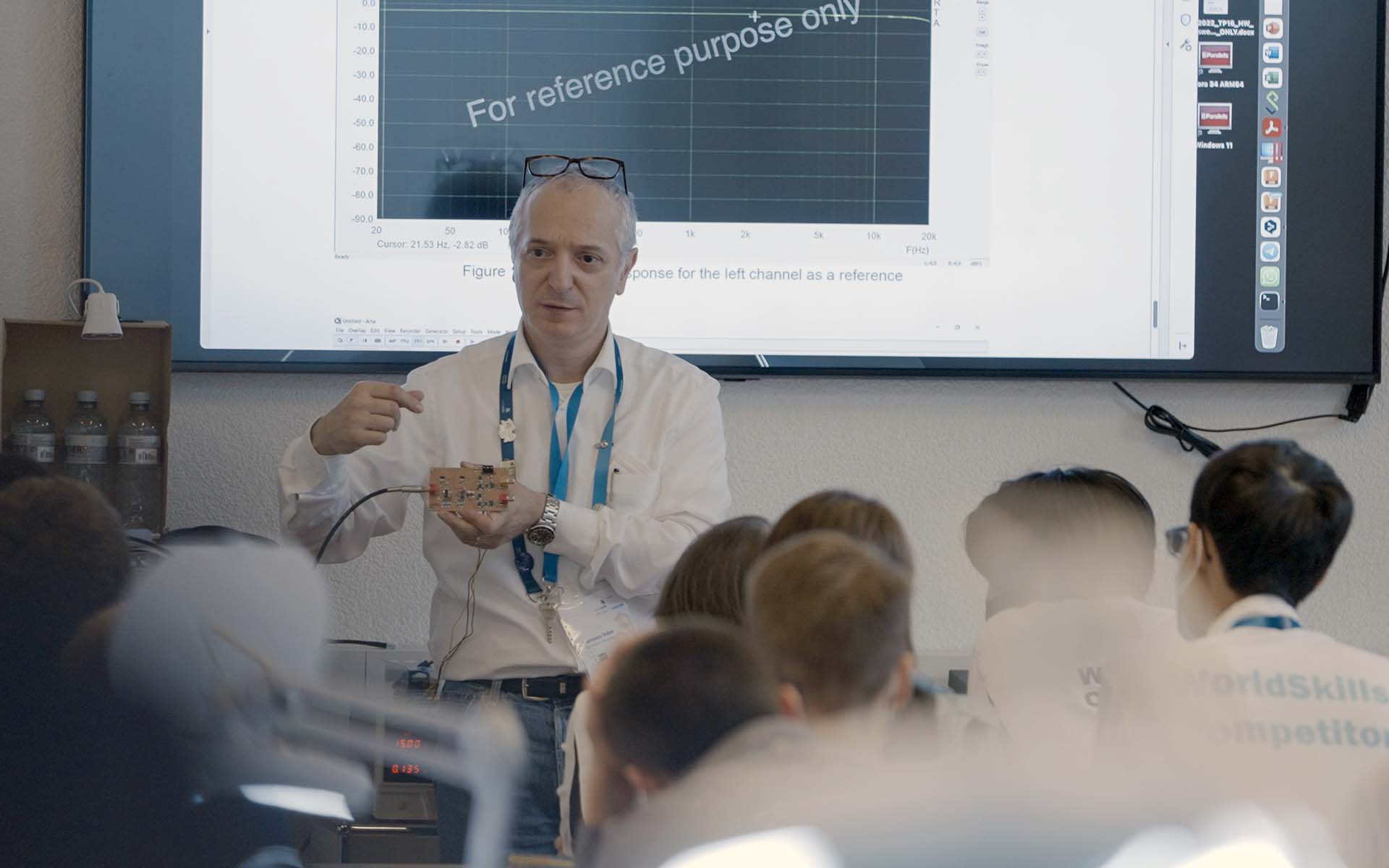 Vom 19. bis 24. Oktober trafen sich dann die Teilnehmerinnen und Teilnehmer aus 17 Nationen mit den betreuenden Experts und Technical Delegates im ICT Berufsbildungscenter Bern (Schweiz). Dabei mussten die Teilnehmenden Aufgaben aus der Elektronik lösen. Diese beinhalteten eine Schaltungs­entwicklung mit anschließender Simulation, Schaltplaneingabe, Leiter­platten­design sowie Aufbau und Test. Professor Volpe wählte als Aufgabe einen Digital-/Analog-Wandler für Audioanwendungen.