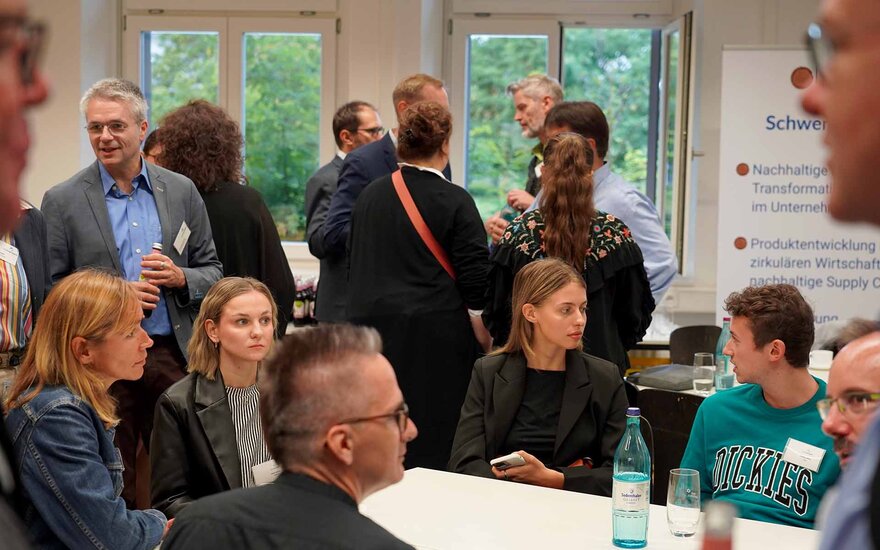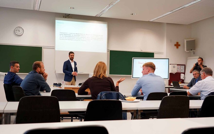 Prof. Dr. Carsten Reuter und Joachim Schmitt (mainproject) moderierten die dritte Session. Gemeinsam mit den Teilnehmenden tauschten sie sich über zielgruppengerechte Berichterstattung und Kommunikationsstrategien für unternehmerische Nachhaltigkeit aus. Dabei wurde festgestellt, dass der Anspruch an Nachhaltigkeit von Produkten und Prozessen von Kundinnen und Kunden, (potenziellen) Mitarbeitenden, vom Gesetzgeber und vom eigenen Anspruch im Interesse zukünftiger Generationen zu handeln, komme. In Bezug auf eine erfolgreiche Nachhaltigkeitsstrategie gelte es, wesentliche Faktoren zu identifizieren, Ziele zu entwickeln und die Entwicklung entsprechend zu gestalten. Dieser Prozess müsse dokumentiert und sowohl für die Öffentlichkeit als auch für Banken und Kundschaft aufbereitet und mit Zahlen hinterlegt werden.
