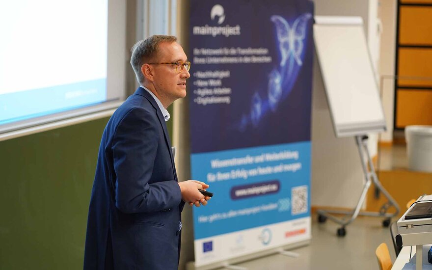 60 Teilnehmende – Fach- und Führungskräfte aus kleinen und mittleren Unternehmen (KMU) aus der Region Bayerischer Untermain – fanden sich am vergangenen Donnerstag an der TH Aschaffenburg ein, um beim mainproject Wirtschaftssymposium wertvolle Impulse für ihr Business mitzunehmen. Das Symposium, das von Prof. Dr. Georg Rainer Hofmann und Prof. Dr.-Ing. Klaus Zindler, Vizepräsident für Forschung und Transfer, eröffnet wurde, bot einen breiten Rahmen zur qualifizierten Behandlung und vertiefenden Diskussion aktueller Problemstellungen. Zu den Themen zählten u. a. Nachhaltigkeit, New Work, Agilität und Digitalisierung.