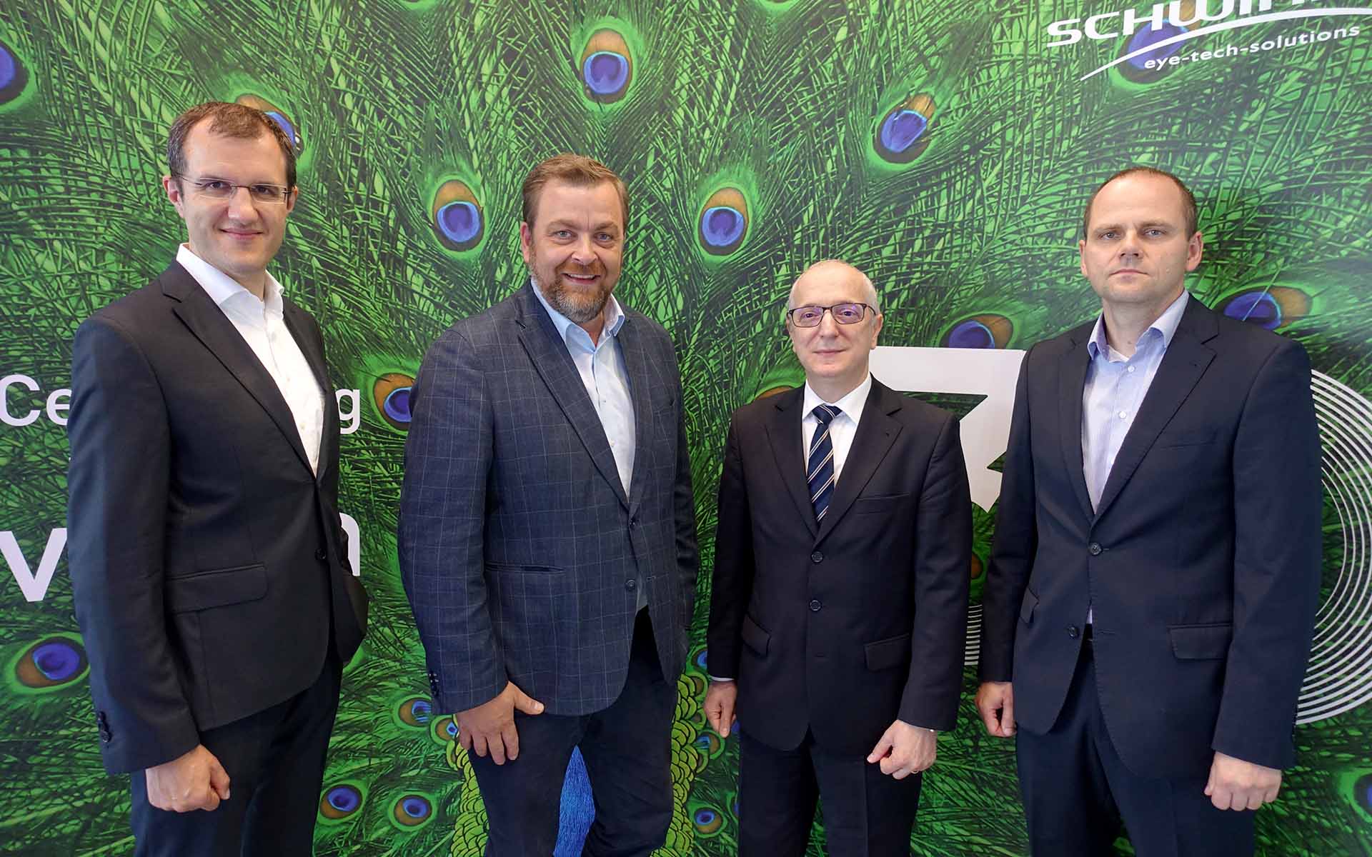 Foto (v. l.): Prof. Dr. Peter Gordon Rötzel, Andreas Rödel (Chief Customer Officer, Firma Schwind), Prof. Dr.-Ing. Francesco Volpe und Peter Kokott (Wissenschaftlicher Mitarbeiter, TH Aschaffenburg)