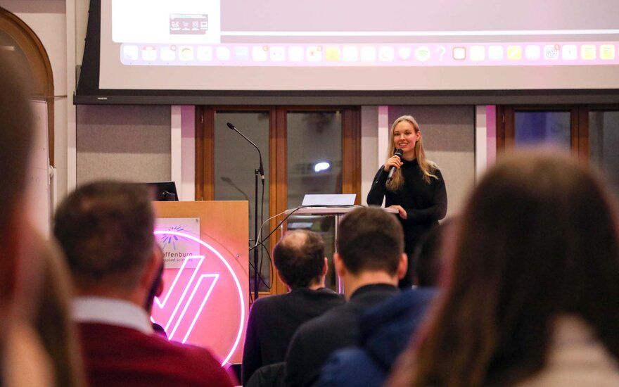 Das Highlight der Gründungswoche war der Gründerstammtisch, der am 16. November in der Aula der TH Aschaffenburg stattfand. Janine Weirich, Co-Founderin der xeem GmbH und bekannt aus der "Höhle der Löwen", teilte dort ihre persönlichen Erfahrungen und Einblicke in die Welt der Unternehmensgründung. Die Diskussionsrunde ermöglichte es den Teilnehmenden nicht nur von einer erfolgreichen Gründerin zu lernen, sondern förderte auch den Austausch und die Vernetzung unter den Teilnehmern.