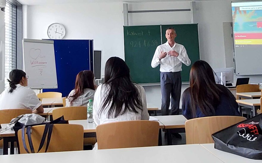 Prof. Dr. Daniel James von der Fakultät für Global and Community Studies und Direktor des International Affairs Center an der TH-AB-Partnerhochschule Hiroshima Shudo University begleitete die japanischen Teilnehmenden nach Aschaffenburg. Hier hielt er zwei interaktive Gastvorträge, die den Zuhörenden echtes „Intercultural Co-Learning“ ermöglichten. Außerdem konnten die Deutschlernenden ihre Computerkenntnisse in einem SAP-Crashkurs erweitern.