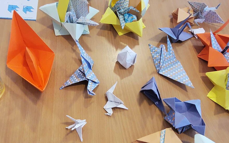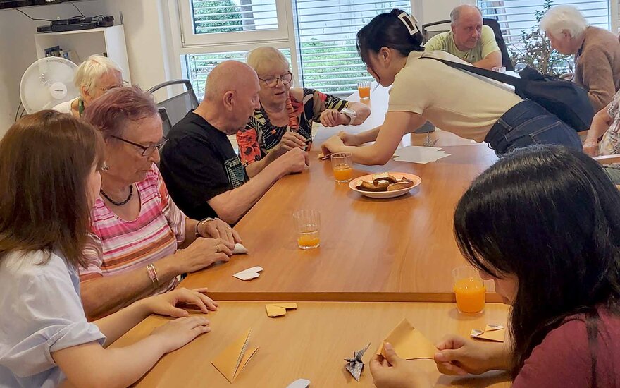 Bei einem Nachmittag in einem Aschaffenburger Seniorenheim erhielten die Kursteilnehmenden die Gelegenheit, mit der örtlichen Bevölkerung in Kontakt zu treten und sich dabei sozial zu engagieren. Vor allem die asiatischen Sprachlernenden brachten den Bewohnerinnen und Bewohnern des Heimes spielerisch die japanische (Origami) und koreanische (Jong-Ijeobgi) Papierfaltkunst näher und wandten dabei erste Deutschkenntnisse an.