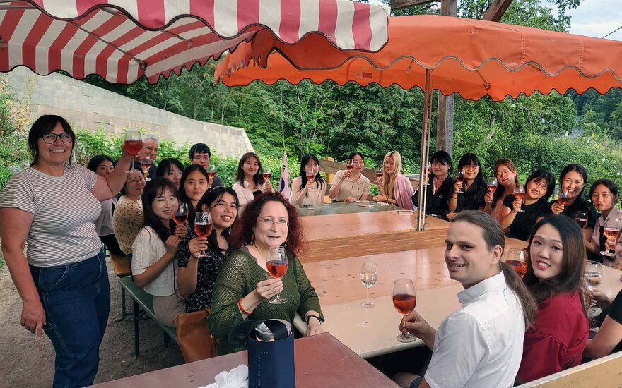 Während eines Abends auf dem Weinberg am Godelsberg gewannen die Deutschlernenden Einblicke in die Geschichte und die aktuellen Herausforderungen des Weinbaus in der Region sowie die Tradition der Häcker-Wirtschaften. Bei diesem Anlass konnten sie sich zudem mit der Nachbarschaft sowie mit Dozierenden, Masterandinnen und einer kooperativen Doktorandin von Prof. Dr. Renate Link austauschen und bereits weitere Deutschkenntnisse unter Beweis stellen.