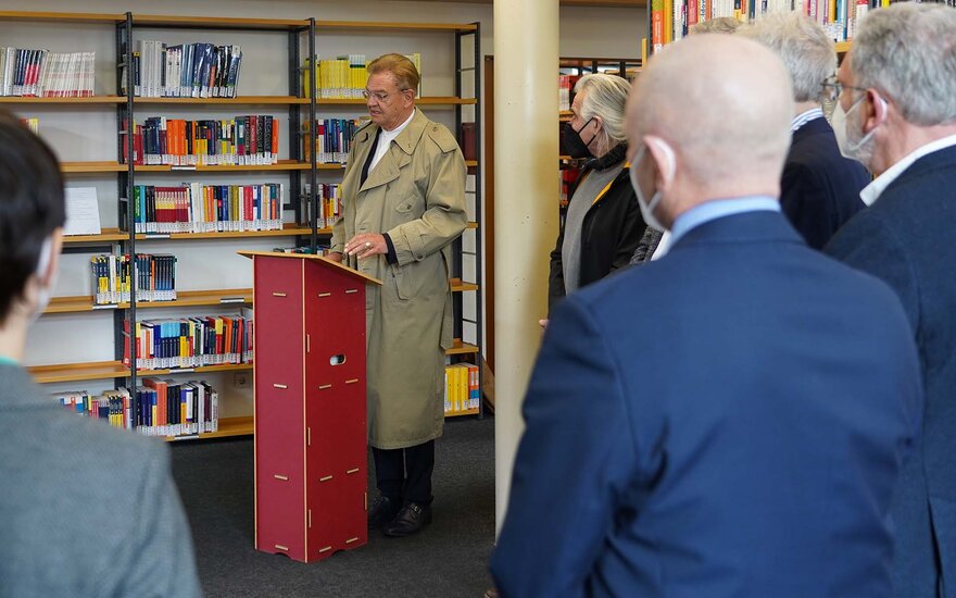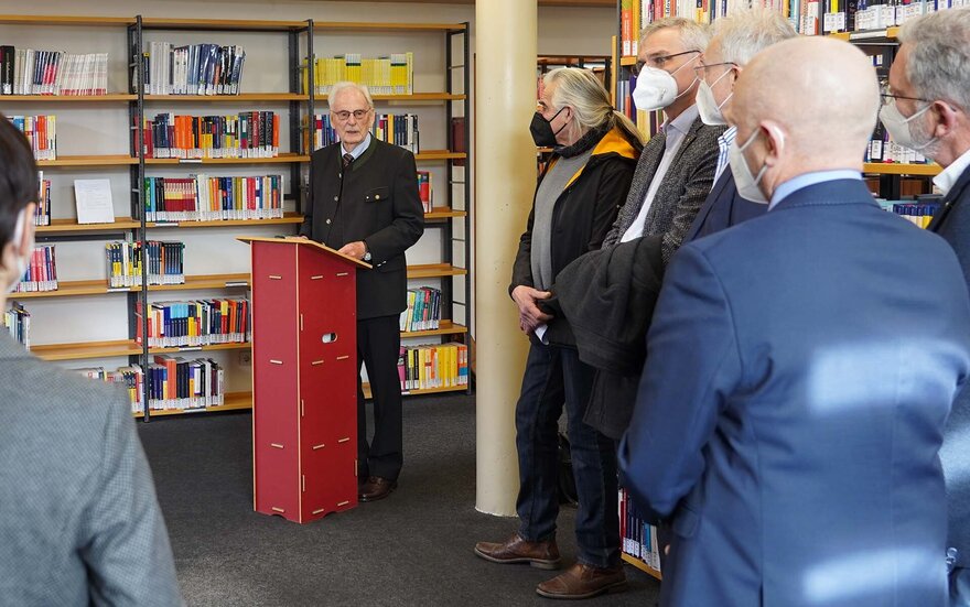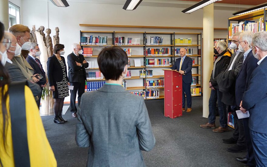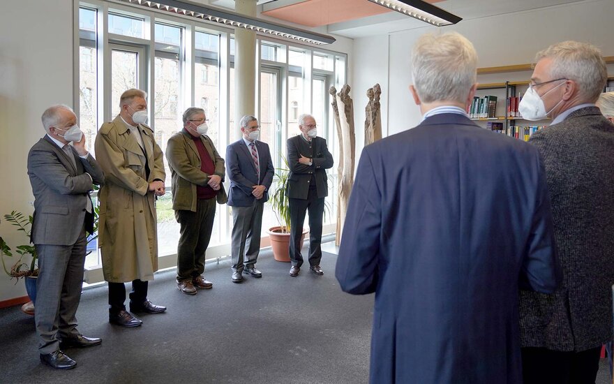Zur Übergabe des Kunstwerks in der Bibliothek begrüßte die Hochschulleitung unter anderem die Präsidenten und einige Mitglieder der Lions Clubs Aschaffenburg-Alzenau, Aschaffenburg-Pompejanum und Aschaffenburg-Schöntal sowie den stellvertretenden Aschaffenburger Landrat Andreas Zenglein, den stellvertretenden Miltenberger Landrat Günther Oettinger, den Bürgermeister der Stadt Aschaffenburg Eric Leiderer und die Bürgermeisterin Jessica Euler. Auch Prof. Dr. Wilfried Diwischek, ehemaliger Präsident der TH Aschaffenburg und Vorsitzender des Fördervereins, war unter den Gästen.